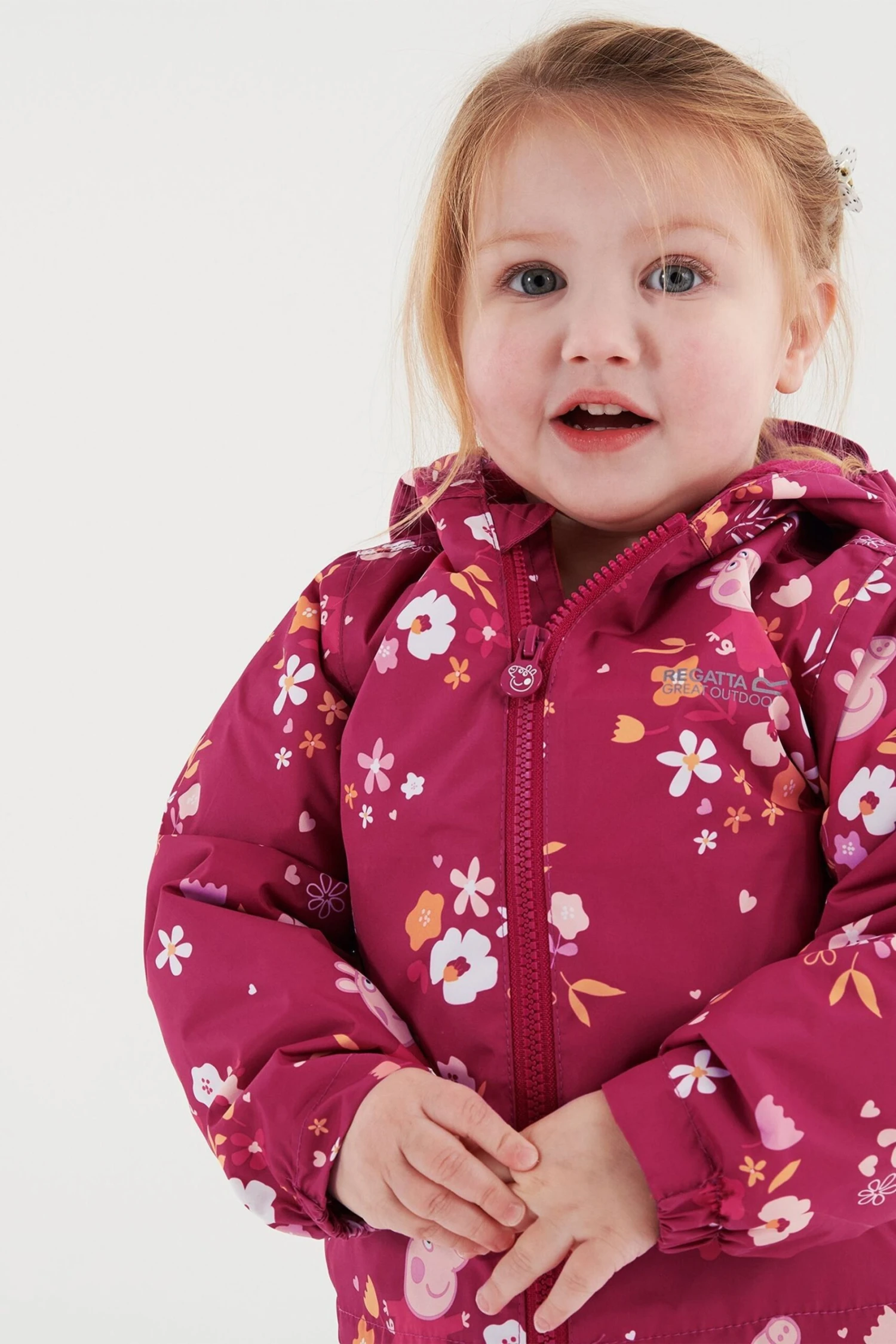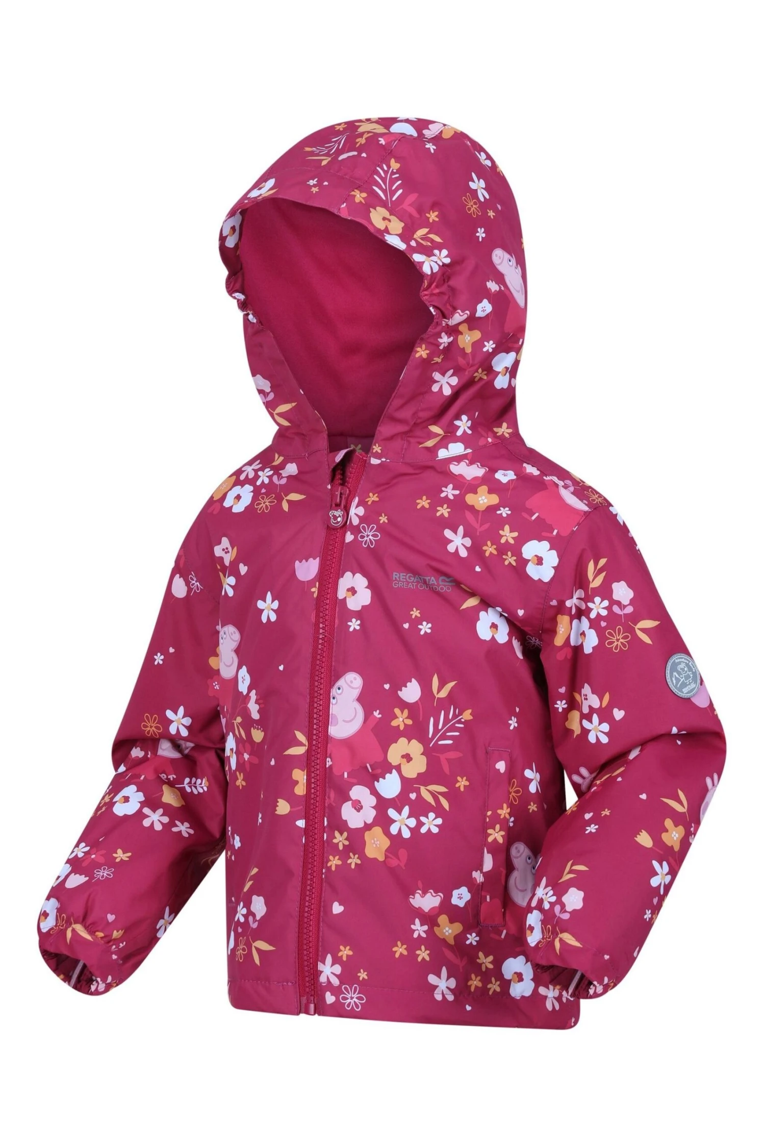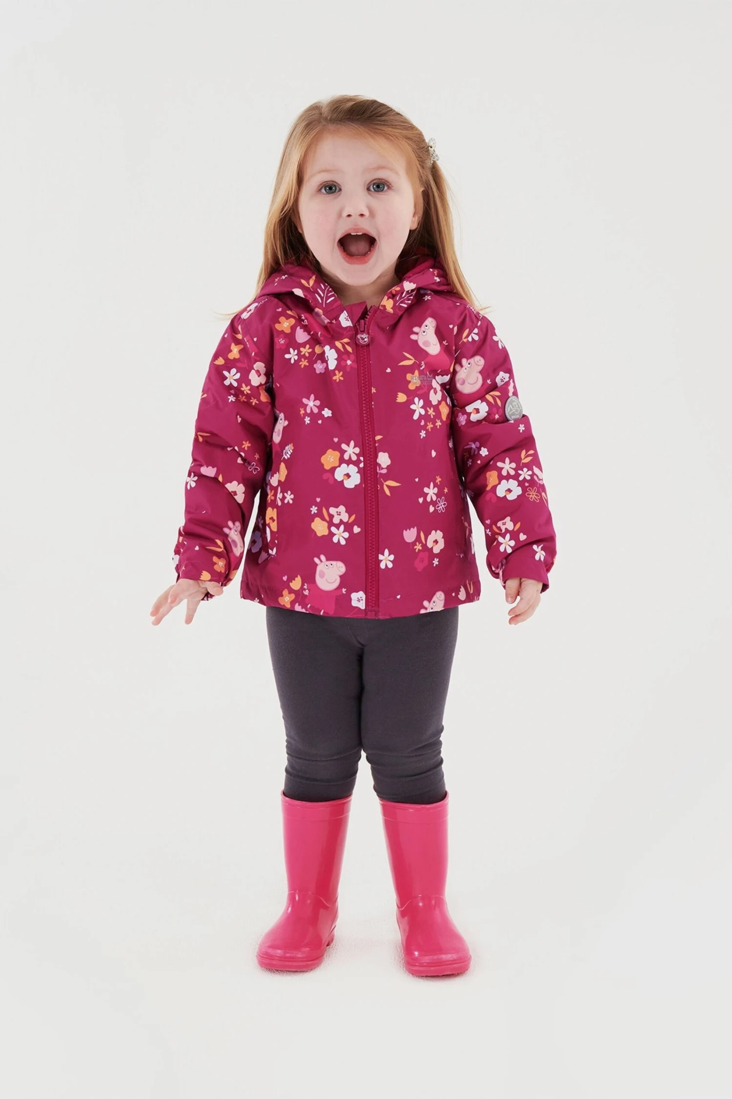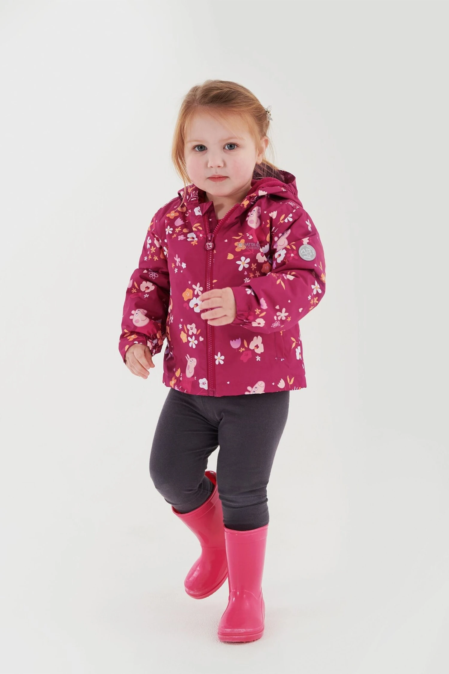 The Padded Muddy Puddle Jacket from Regatta. The jacket comes with a water-repellent finish and warming insulation. The reflective trim is ideal for visibility in low light. The jacket comes with a Peppa Pig print, perfect for brightening up rainy days outdoors.