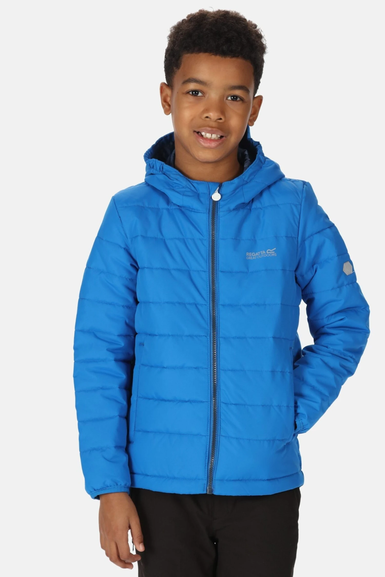 The Junior Helfa from Regatta. The kids jacket comes with a water-repellent finish for protection from light rainfall. The jacket is filled with a medium weight insulation to keep you toasty. The reflective trim will keep them visible when adventures run into low light.