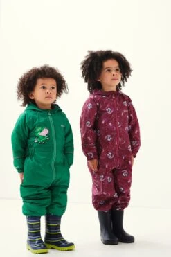 The Peppa Pobble from Regatta. The all-in-one suit features a water-repellent finish to protect from rainfall and muddy puddles. It’s breathable and lightweight too, perfect for mini adventures. The print is perfect for brightening up rainy days outdoors.